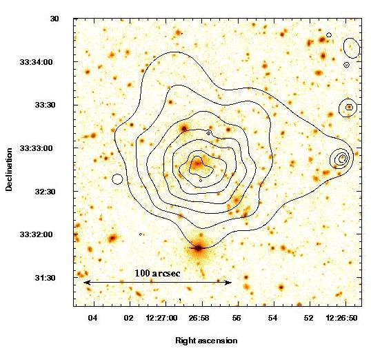 The image above shows contours of the X-ray emission detected by the three EPIC cameras aboard XMM, overlayed on a Subaru I-band image. With a gas temperature of 11.5 keV, this system is the hottest known at redshifts higher than 0.6, and it also appears relaxed.