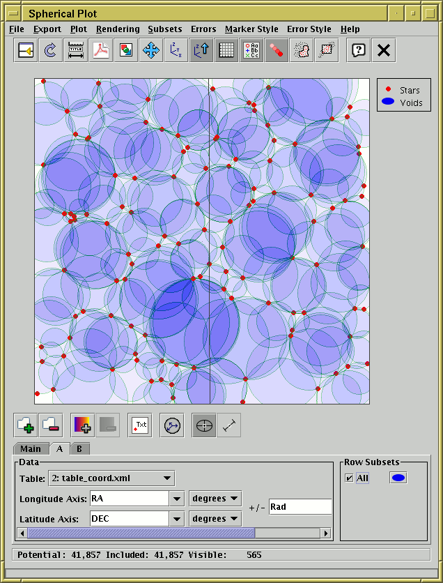 This is a spherical plot in which the red points are positions of stars, and the pale blue circles are maximal circular regions known to contain no stars. The circles (and their outlines, which are provided by a separate dataset using the same data) are actually "error bar" representations. Since the void regions are plotted using a fairly high transparency value, it's easy to see where some or many overlap.