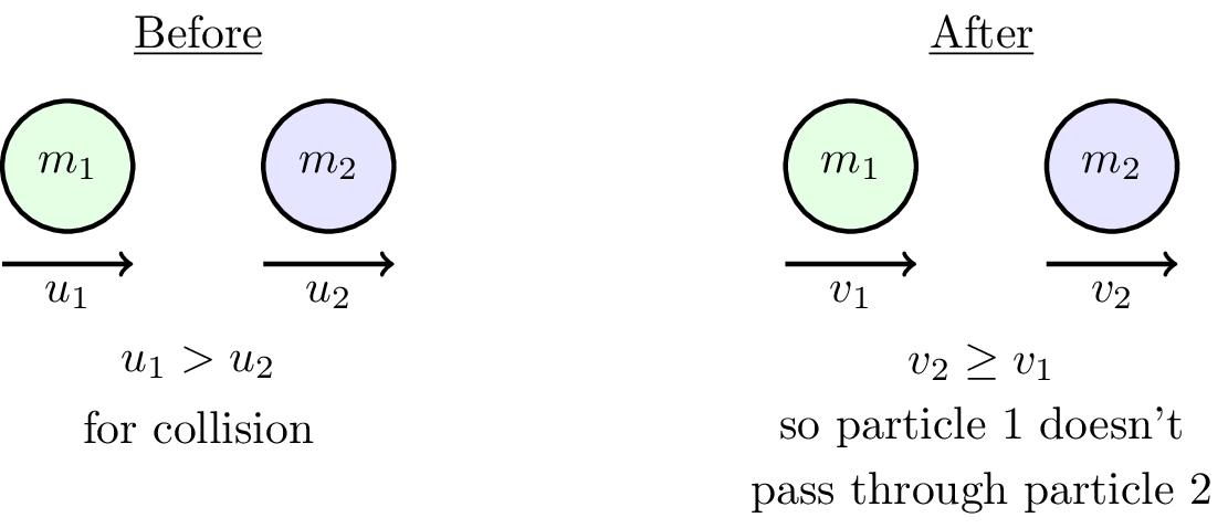 Before the collision \(u_1 > u_2\) otherwise the particles would not collide. After the collision \(v_2 \ge v_1\) because the particles can’t pass through each other (at least in classical mechanics).