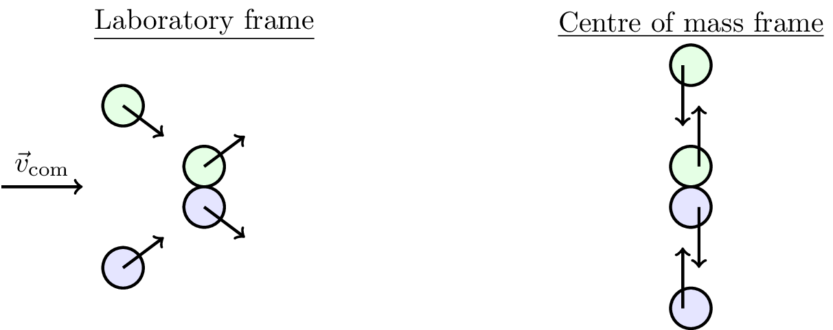 Perfectly inelastic collisions: If \(e = 0\) we have perfectly inelastic collisions, \(v_2 = v_1 = v\), so the particles stick together. \(v\) will be equal to \(v_\text{com}\), the velocity of the centre of mass.