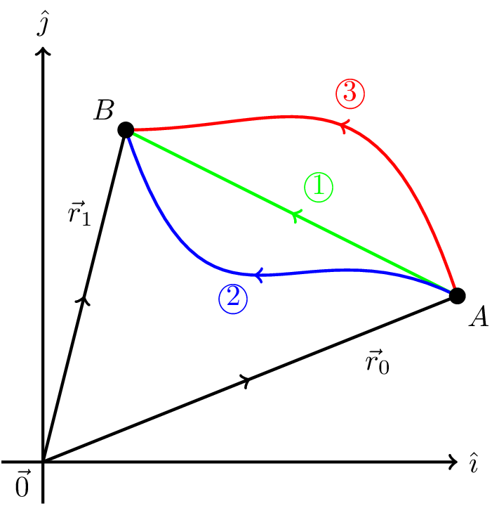 Don’t worry about the 3D maths and the path integral described above; that will be covered in maths units later. The important physics point is that for a conservative force the potential difference between two points \(A\) and \(B\) only depends on those points, it does not matter what path the particle took to get from \(A\) to \(B\).
