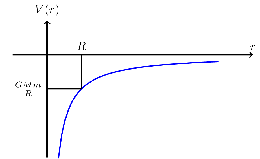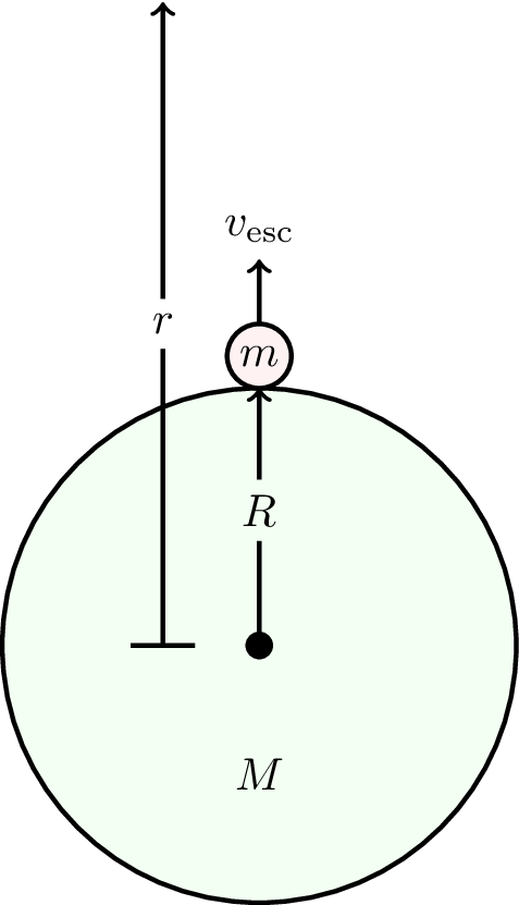 If the particle just escapes to infinity, this means that the velocity \(v \to 0\) as \(r \to \infty\). The final total energy is zero, if we define the zero point of the gravitational potential to be at infinity (see Figure 6.9). We can then use conservation of energy \[ \underbrace{0}_{\color{blue}\text{final energy}} = \underbrace{-\frac{GMm}{R}}_{\color{blue}\text{initial PE}} + \underbrace{\frac{1}{2}mv^2_\text{esc}}_{\color{blue}\text{initial KE}} \]