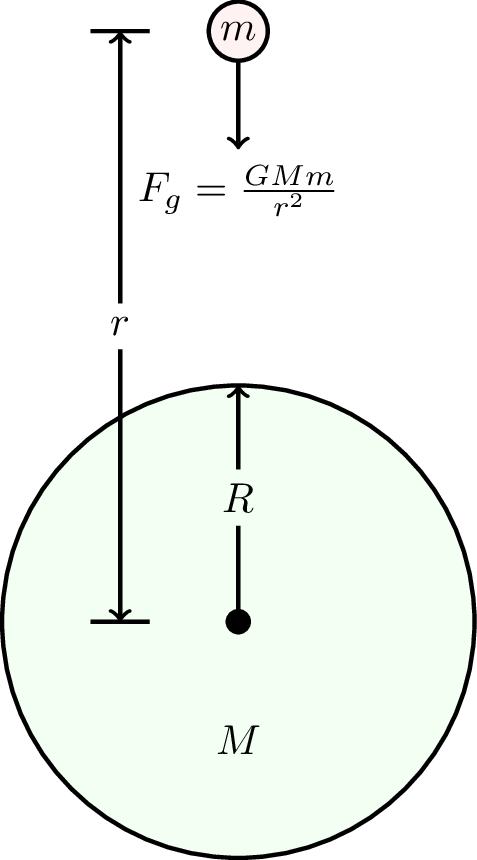 Newton’s law of gravity states that the force between the particle of mass \(m\) and the planet of mass \(M\) is given by \[ F = - \frac{GMm}{r^2} \] where \(r\) is the distance between the particle and the centre of the planet, and \(G\) is the gravitational constant. To escape gravity we need to take the particle from the surface at radius \(R\) to \(\infty\). The work done against the force of gravity will be \[ \Delta V = V(\infty) - V(R) \] \[ \Delta V = \int_R^\infty \left(-\frac{GMm}{r^2}\right) dr = GMm \left[ -\frac{1}{r} \right]_R^\infty \] \[ \therefore \Delta V = \frac{GMm}{R} \] for escape to infinity, i.e., the particle needs to gain this energy.
