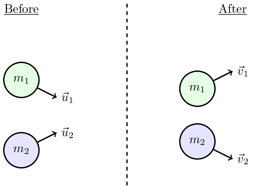 This gives \[ m_1 \vec{u}_1 + m_2 \vec{u}_2 = m_1 \vec{v_1} + m_2 \vec{v_2} \] which can be expanded to give three equations for conservation of energy in the \(x\), \(y\), and \(z\) directions. I.e., \[ m_1 u_{1x} + m_2 u_{2x} = m_1 v_{1x} + m_2 v_{2x} \] \[ m_1 u_{1y} + m_2 u_{2y} = m_1 v_{1y} + m_2 v_{2y} \] \[ m_1 u_{1z} + m_2 u_{2z} = m_1 v_{1z} + m_2 v_{2z} \] where \(u_{1x}\) is the \(x\) component of the velocity of particle 1 before the collision, etc. and momentum is separately conserved in each direction.