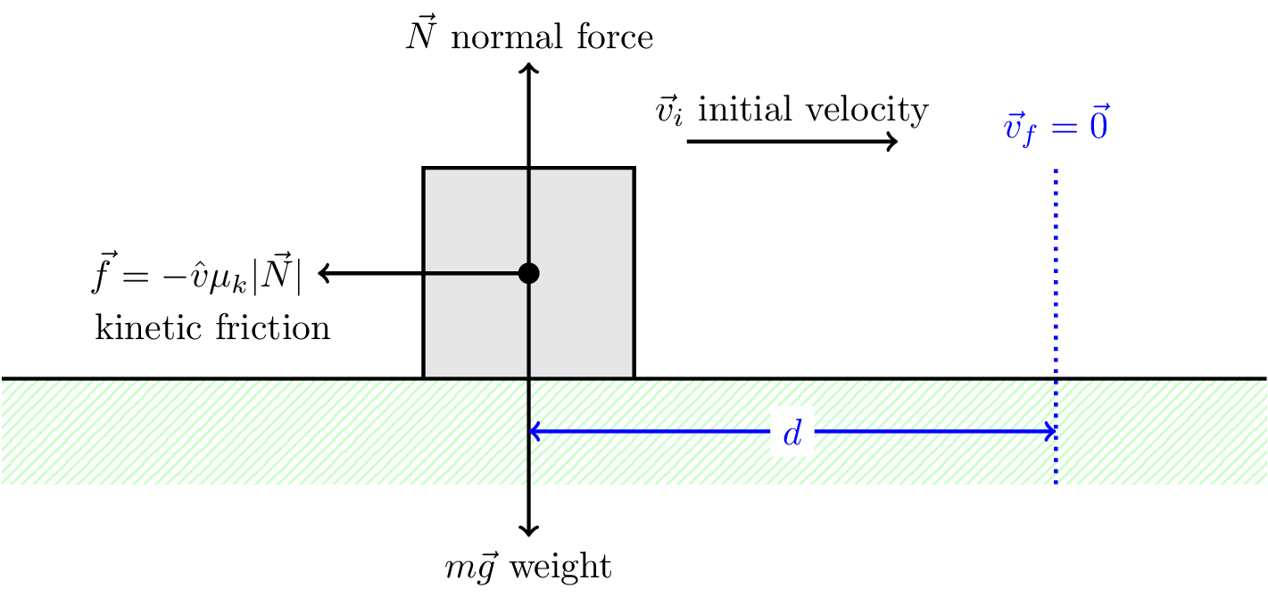 \[ \Delta W = 0 - \frac{1}{2} m v_i^2 \] \[ F = \mu_k N = \mu_k mg \] \[ \Delta W = \vec{F} \cdot \vec{d} = -F d = -\mu_k mgd \] \(\Delta W < 0\) as particle loses kinetic energy. We can equate \(\Delta W\) with the kinetic energy to get \[ \frac{1}{2} m v_i^2 = \mu_k mgd \] \[ \therefore v_i^2 = 2 \mu_k gd \]