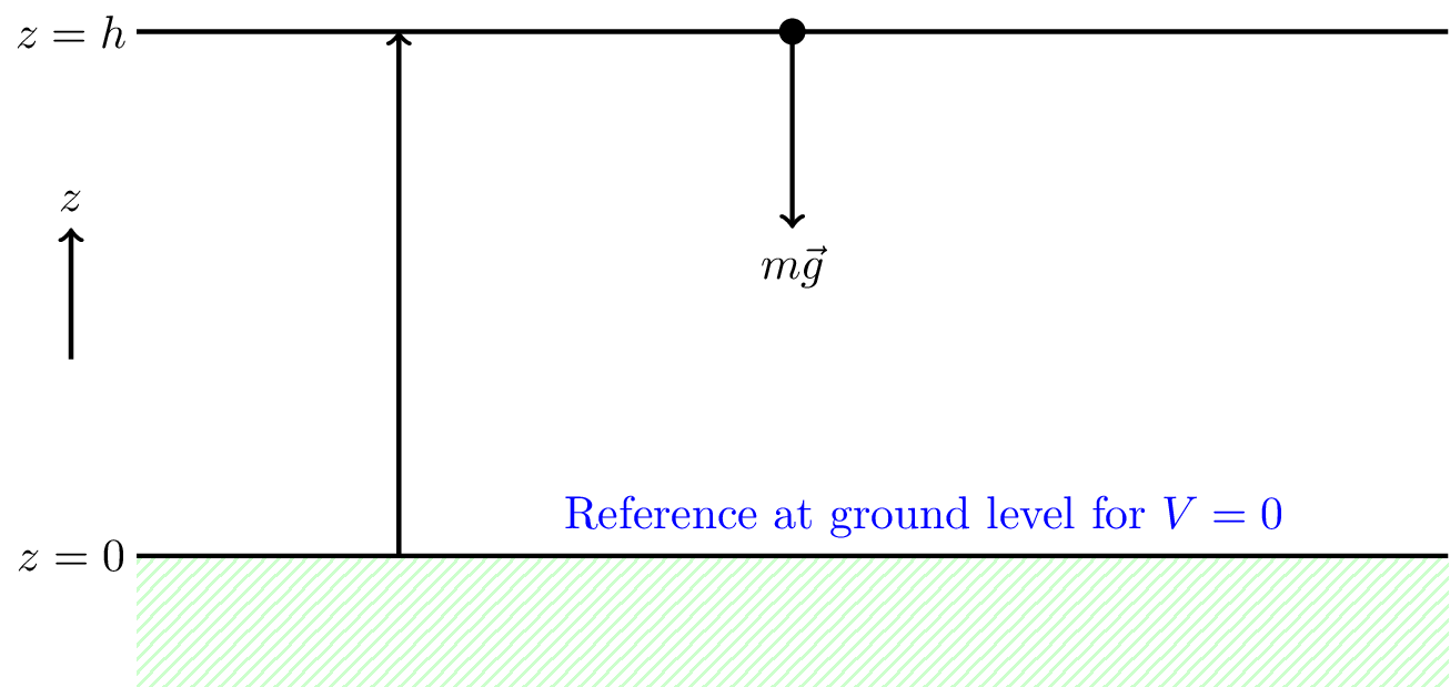 The potential difference is given by \[ \Delta V = V(h) - V(0) \] \[ \Delta V = - \int_0^h (-mg) dz = mgh \] Note the minus sign because we’ve defined positive \(z\) to be up. \[ \therefore V(h) = mgh + V(0) \] where \(V(0)\) is the potential at \(z=0\) which we can choose to be our reference level with a potential of zero.