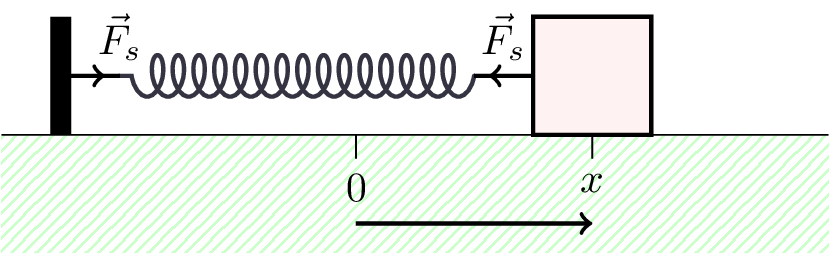 We can caluclate the work done by moving the block and stretching the spring from \(0\) to \(x\), as show in Figure 6.7.