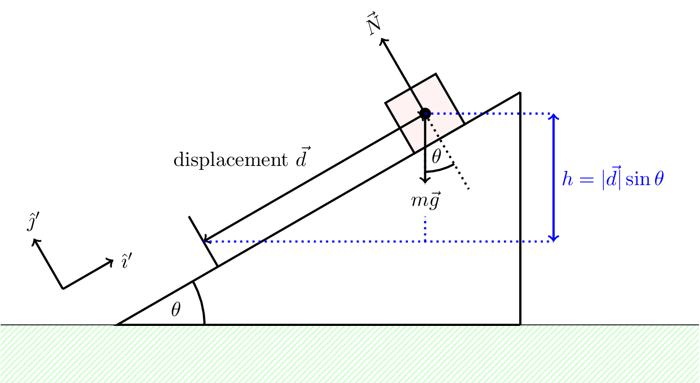 The component of the gravitational force parallel to the plane is \[ mg \sin\theta \] This means that the work done is this component of the force times the distance moved, \(d\), given by \[ W = mgd \sin\theta \] Interestingly, the work done exactly matches the loss of gravitational potential energy, \(mgh\), where \(h = d \sin\theta\) is the vertical distance the block falls through (see Figure 6.2). This is not a coincidence, as we will see later.