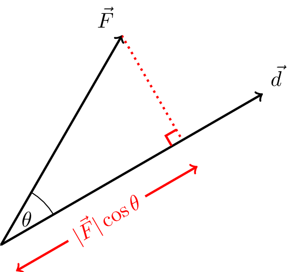 Work done, \(W\), by a force \(\vec{F}\) at an angle \(\theta\) to the displacement \(\vec{d}\) is given by the scalar product of \(\vec{F}\) and \(\vec{d}\), \[ W = \vec{F} \cdot \vec{d} \]