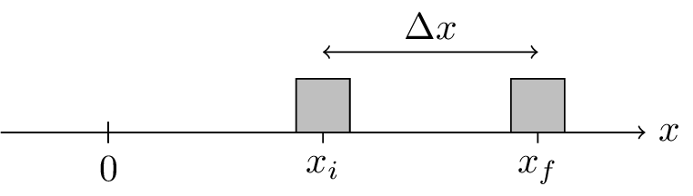 Consider a train moving along a track. At some initial time \(t_\text{i}\) the train is a distance \(x_\text{i}\) along the track. At some later time \(t_\text{f}\) the train has moved further along the track to a position \(x_\text{f}\). The displacement of the train is the difference between the final and initial positions, \[ \Delta x = x_\text{f} - x_\text{i}. \] The Greek capital letter \(\Delta\), “delta”, is often used to denote a large change such as this. (A lower case delta is often used to represent small changes, \(\delta \ll 1\)).)