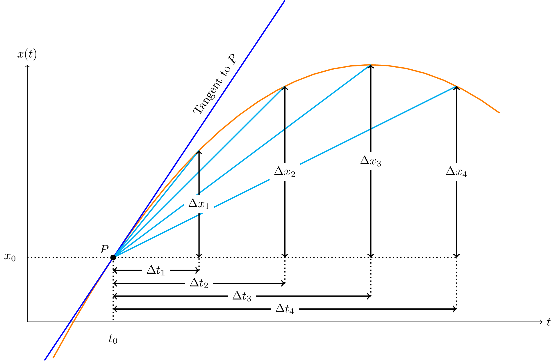 How can we define the velocity at an instant in time? We can look at the average velocity over progressively smaller intervals of time. This is shown in Figure 2.2, where we are considering the velocity at some time \(t_0\) and position \(x_0\), denoted by the point \(P\) in the figure. As we estimate the velocity using shorter and shorter time intervals, our velocity estimate gets closer and closer to the tangent at point \(P\).