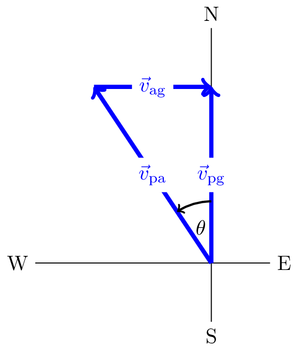 The wind will tend to blow the plane off course to the east. To compensate for this the pilot has to have some component of their motion into the wind. This is illustrated in Figure 3.5. We can see that the velocity of the plane relative to the ground, \(\vec{v}_\text{pg}\), is given by \[ \vec{v}_\text{pg} = \vec{v}_\text{pa} + \vec{v}_\text{ag}. \] The desired angle is then given by \[ \sin(\theta) = \frac{|\vec{v}_\text{ag}|}{|\vec{v}_\text{pa}|} = \frac{v_\text{ag}}{v_\text{pa}} = \frac{15}{70} = 0.214. \] \[ \theta = 12.1^\circ. \]