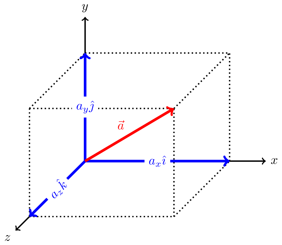 In cartesian coordinates in three dimensions we denote unit vectors in the \(x\), \(y\), and \(z\) directions as \(\hat{\imath}\), \(\hat{\jmath}\), and \(\hat{k}\), respectively. These are called basis vectors. Any vector can be written as a linear combination of scalars times these basis vectors. For example, the vector \(\vec{a}\) can be written as \[ \vec{a} = a_x \hat{\imath} + a_y \hat{\jmath} + a_z \hat{k}. \] where \(a_x\), \(a_y\), and \(a_z\) are the components of the vector \(\vec{a}\) in the \(x\), \(y\), and \(z\) directions, respectively. This is illustrated in Figure 3.4.