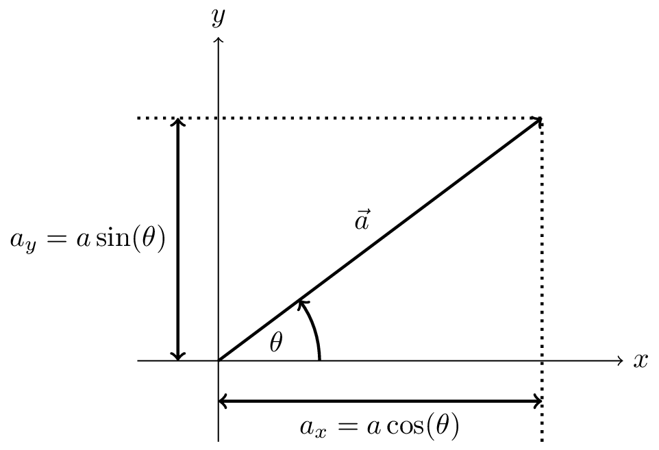 We can also see from the figure that the angle between the vector \(\vec{a}\) and the \(x\)-axis is given by \[ \tan(\theta) = \frac{a_y}{a_x} \] and the magnitude of \(\vec{a}\) is given by \[ \left| \vec{a} \right| = \sqrt{a_x^2 + a_y^2} \] using Pythagoras’ theorem.