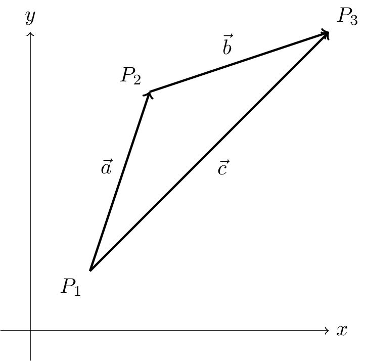 We have seen how to add vectors in Figure 2.1. The sum of two vectors is another vector. The sum of two vectors \(\vec{a}\) and \(\vec{b}\) is written as \[ \vec{c} = \vec{a} + \vec{b}. \]