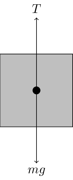 This is an application of Newton’s equations of motion to find the acceleration. Using \[ s = ut + \frac{1}{2} at^2 \] where the initial velocity \(u = 0 \text{ m s}^{-1}\) and rearranging to get \[ a = \frac{2s}{t^2}. \] We can then apply Newton’s second law, \(F = ma\). Looking at Figure 13.4, the net upward force providing the acceleration is \(F = T - mg\). \[ T - mg = ma \] \[ T = mg + ma \] \[ T = m\left(\frac{2s}{t^2} + g\right) \] Substituting in the numbers gives \[ T = 1 \times \left(\frac{2 \times 50}{10^2} + 9.8\right) = 11 \text{ N}. \]