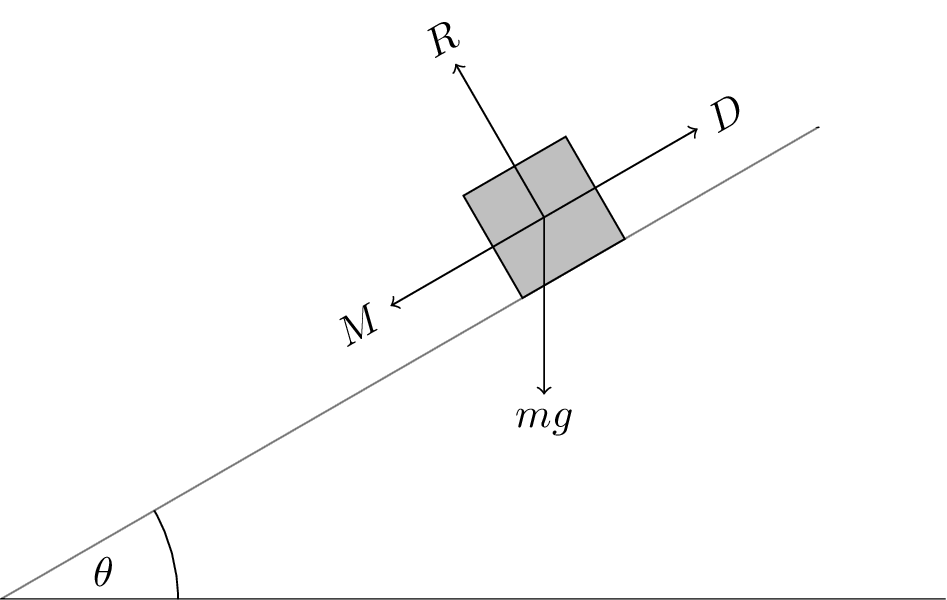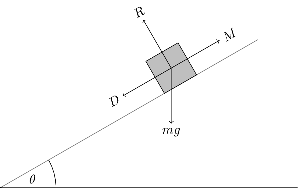 - The motive force and drag force are balanced, \(D = mg \sin \theta + M\).