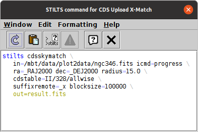 The STILTS window button is currently available from the following windows: Match, TAP, CDS Upload X-Match, and single cone, SIA, SSA and multiple cone, SIA, SSA windows. All the Plot windows have similar functionality from their STILTS Control component.